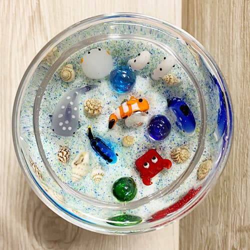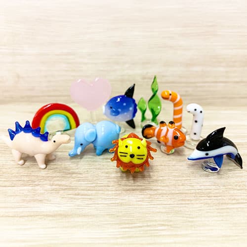 ガラス細工は約30種類。中に入れるモチーフも「動物系」「マリン系」「季節もの」などさまざまな物をご用意しています。