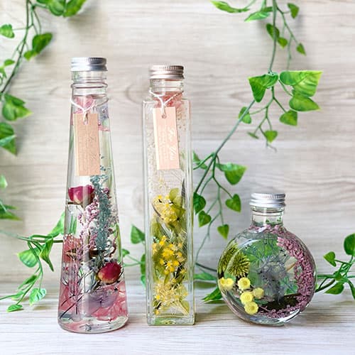 お花を入れるだけでなく、小さな瓶の中にオリジナルの世界を作る楽しさと難しさが魅力の一つです。